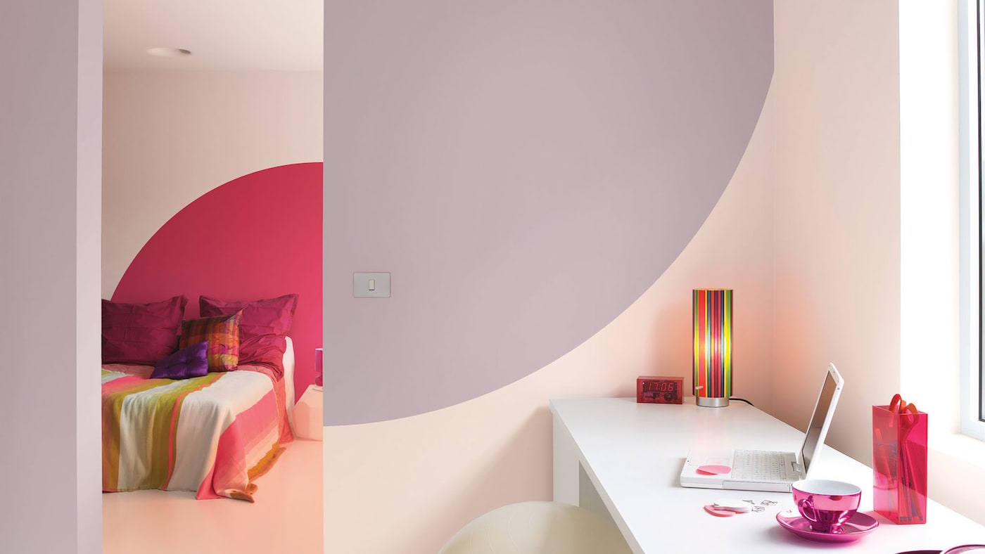 สร้างบรรยากาศโรแมนติกด้วยเส้นโค้งและสีโทนชมพู เส้นโค้งที่ซ้อนกันช่วยสร้างความเชื่อมโยงที่ชัดเจนทางสายตาระหว่างห้องต่างๆ เลือกสีในโทนที่ส่งเสริมกันเพื่อบรรยากาศที่ลงตัว หรือสีที่สดกว่า เพื่อสร้างพลังให้กับห้อง