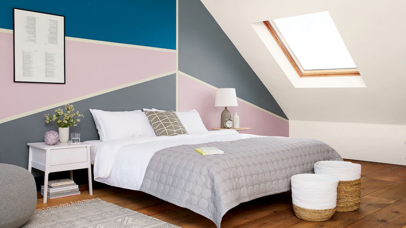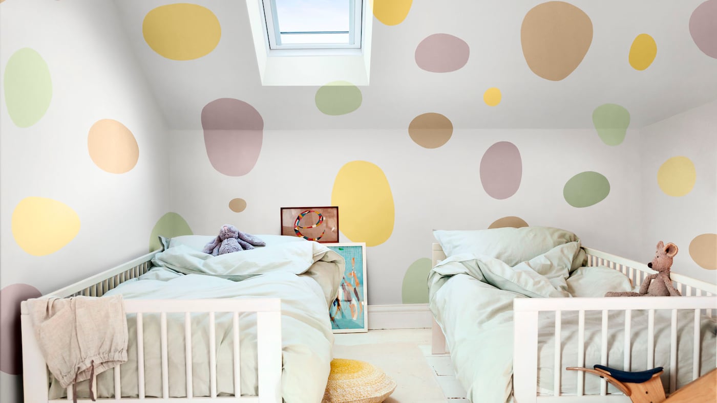 ใช้รูปทรงกลมที่มีสีสดใสเพื่อเพิ่มความสนุกสนานให้กับห้องนอนเด็ก พาเลทสีแบบนุ่มนวลช่วยสร้างชีวิตชีวาให้กับสีพื้นที่เป็นสีกลาง ในขณะที่ให้ความรู้สึกสบายตา การใช้วงกลมซ้อนกันบนผนังคนละด้านจะช่วยให้ห้องดูกว้างขึ้นได้ วาดลายไปถึงเพดานเพื่อสร้างความขี้เล่นให้กับห้องเพิ่มขึ้น